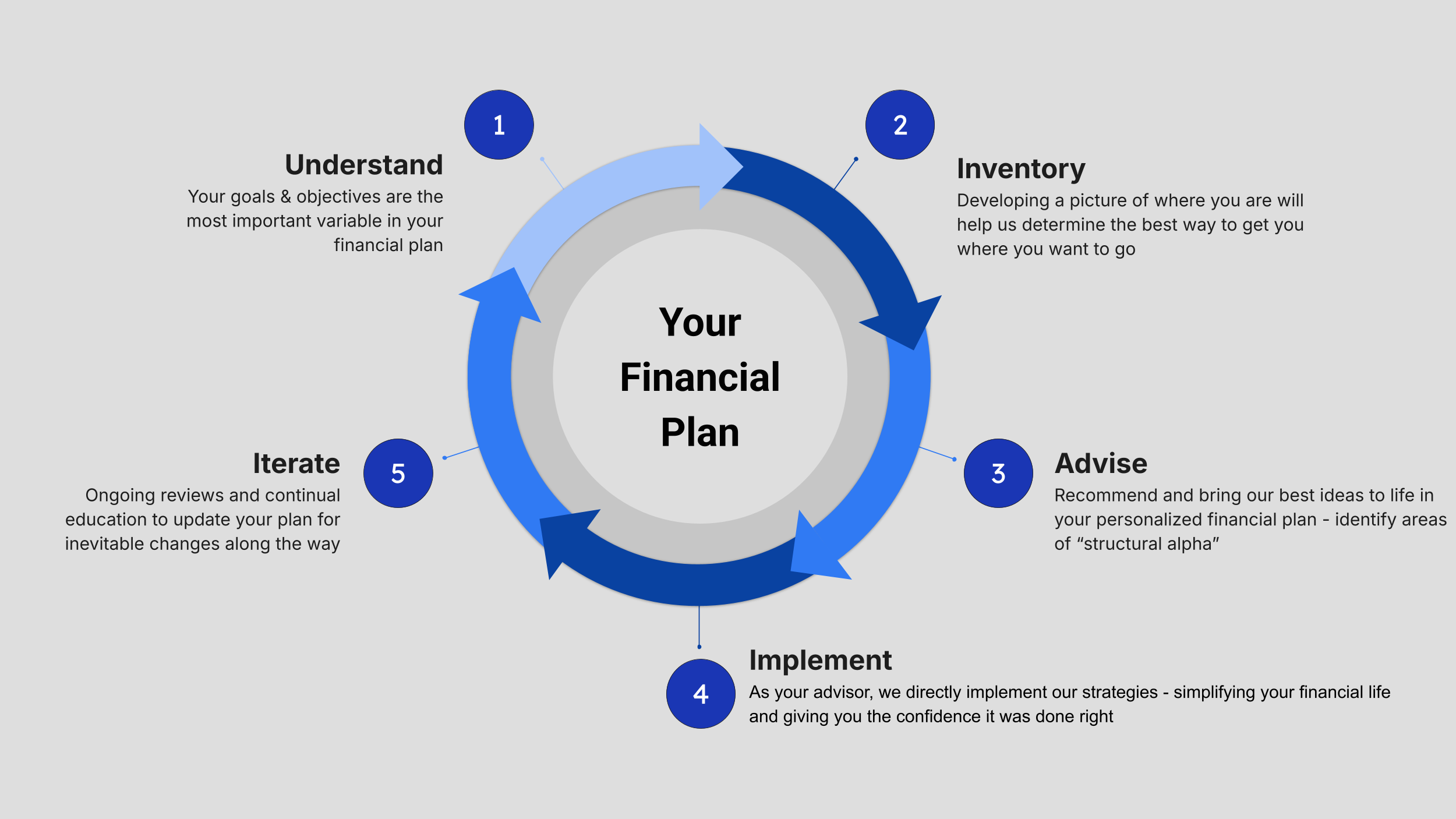 Gain mental clarity via an understandable picture of your goals, assets, and liabilities. We help you get from where you are to where you want to go via a complete financial plan that considers all aspects of your financial life.